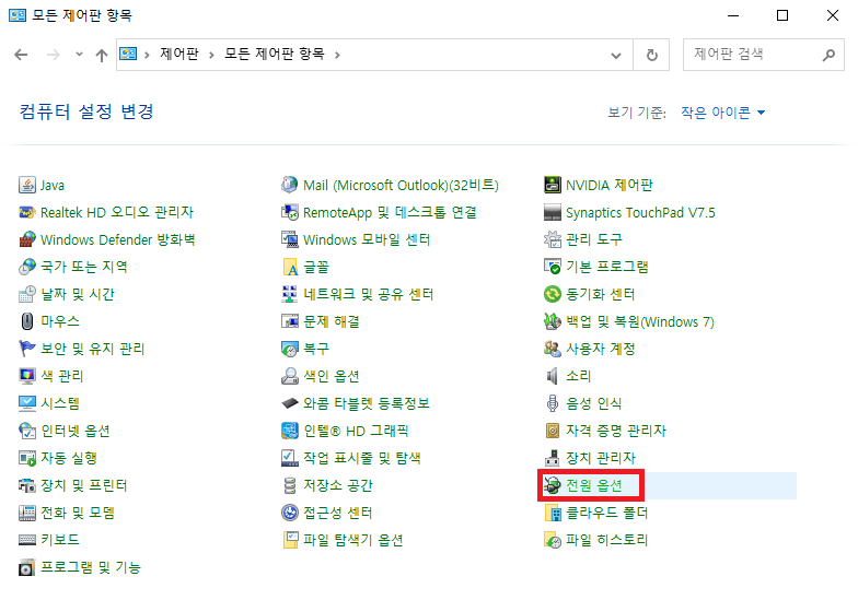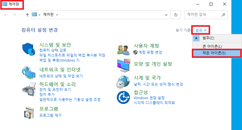 제어판 > 범주 > 작은 or 큰 아이콘 보기