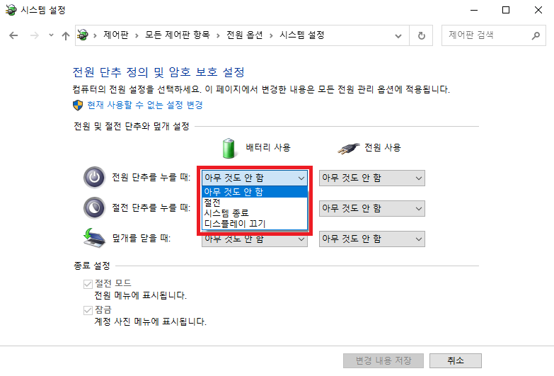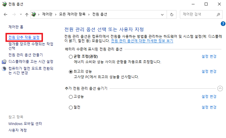 왼쪽의 전원 단추 작동 설정