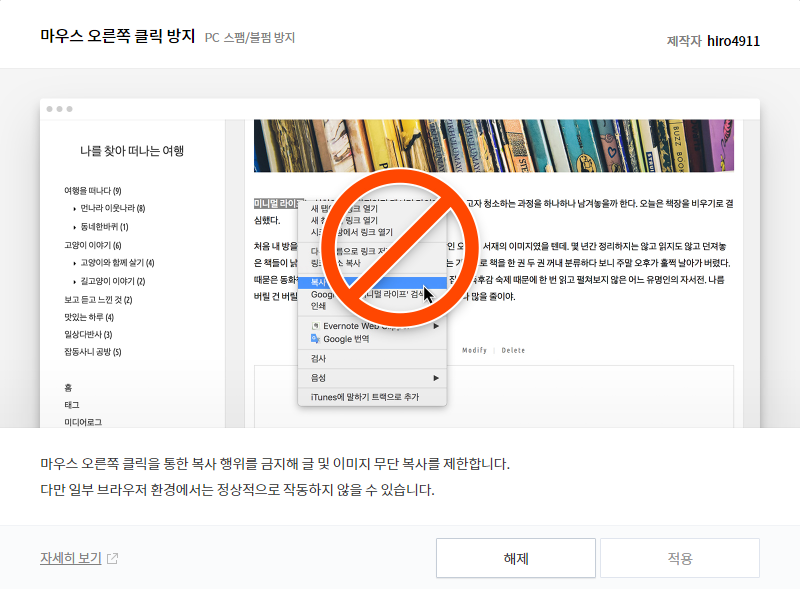 마우스 오른쪽 클릭 방지 기능이 존재한다.