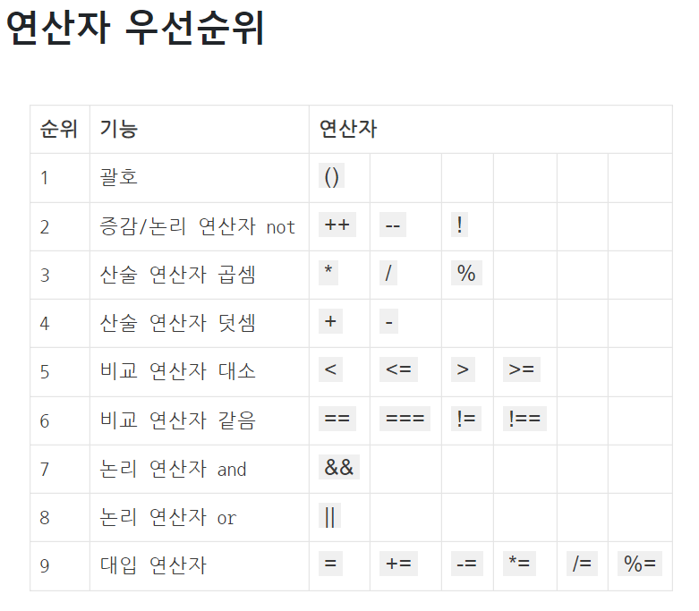 컴퓨터, 프로그래밍/자바스크립트 자바스크립트) 연산자 우선순위표 by 개발자 리브 2023. 6. 21. [Javascript] 연산자 우선순위 연산자들은 한 명령에서 쓰일 때, 서로간에 우선순위를 가지고 연산됩니다. 수학 연산처럼 괄호가 가장 높은 우선 순위를 갖고, 증감, 산술, 비교, 논리, 대입, 비트 순서로 우선순위를 갖습니다. velog.io 공유하기 게시글 관리 개발자 리브 저작자표시 비영리 변경금지 (새창열림) 관련글 자바스크립트) 큐(Queue) 구현 자바스크립트) if문 최소화 (a == 1 || 2 || 3은 안됨?) VSCode) Unterminated string literal 오류 자바스크립트) 난수/랜덤값/무작위 숫자 생성 생성 댓글