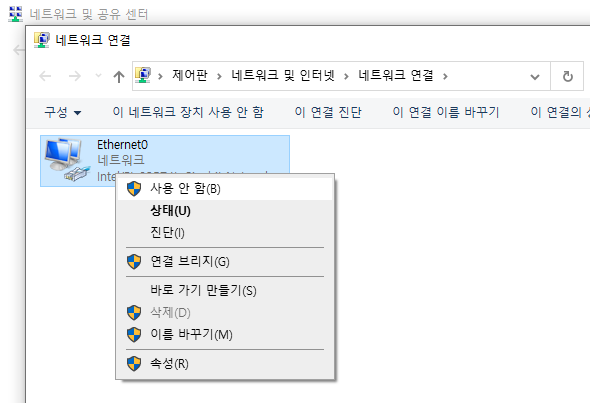 네트워크 어댑터를 사용안함-사용함으로