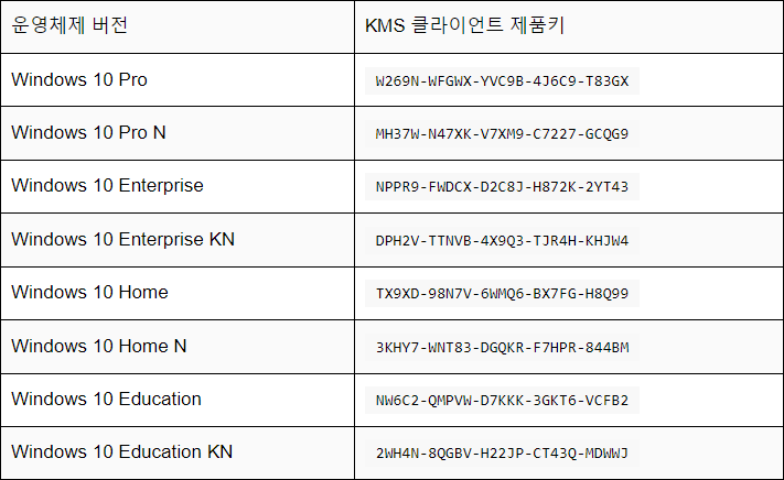 윈도우10에서는 위의 인증키를 이용하여