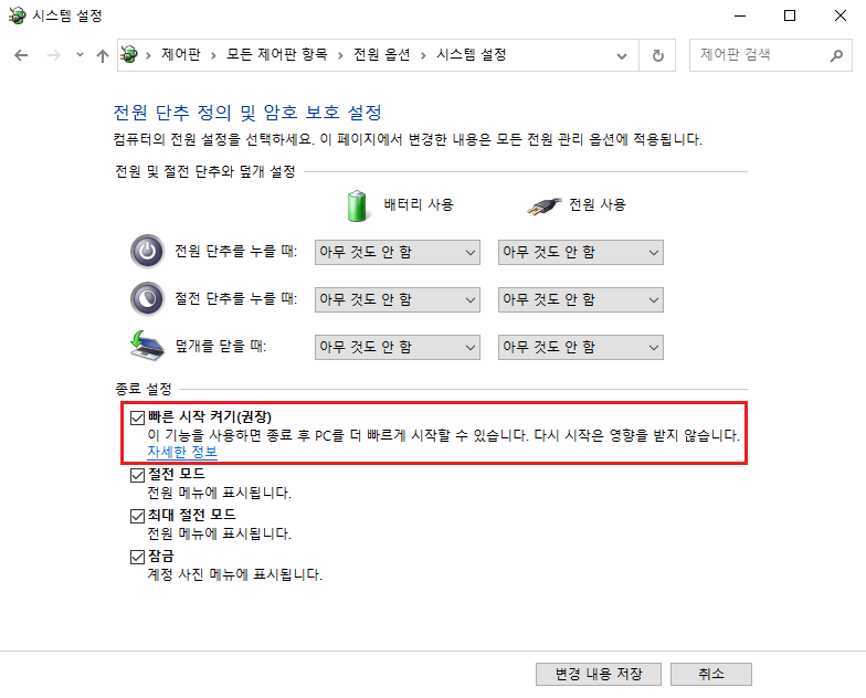 빠른 시작 켜기가 체크되어있는 경우