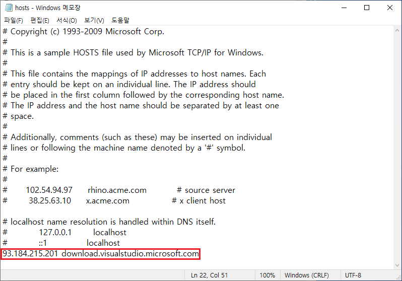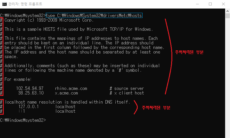 만약 hosts파일에 본인이 입력하지 않은