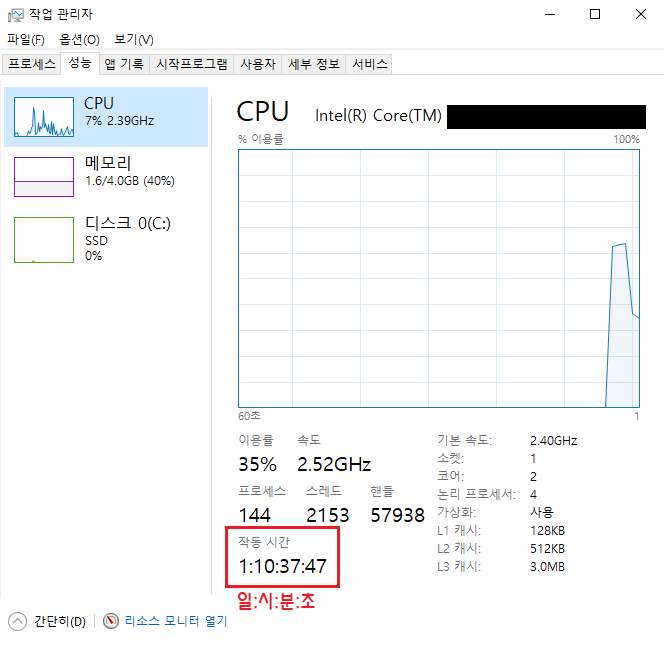 성능 > CPU > 작동 시간 부분을 확인하면 된다.