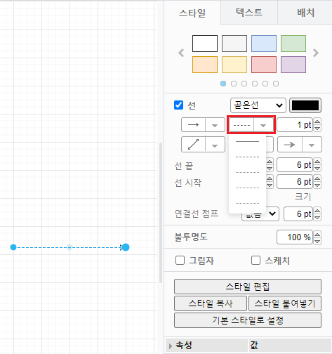 우측 팔레트 > 선 > 2번째의 아이템박스에서