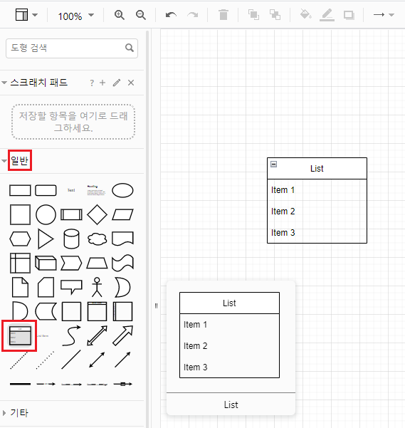 왼쪽 팔레트 > 일반 > List를 이용하여 생성